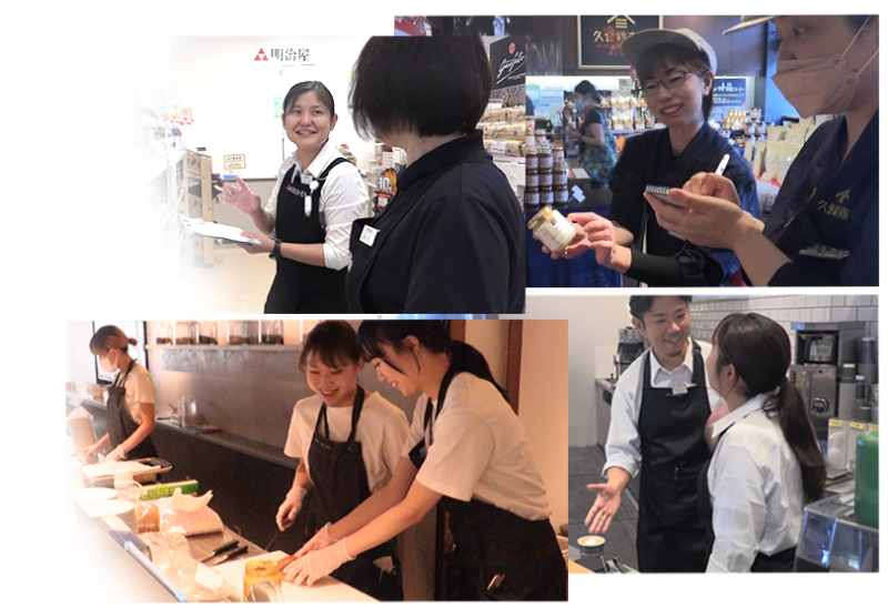 接客販売とそれに付随する業務 (レジ・品出し・発注・清掃など) 飲食店では料理や飲み物の提供、物販店ではギフト提案やラッピングなど、各業態に必要な知識を身につけていただきます。 また、業態によって商品サービス・顧客層など違うので様々な経験ができます。 例えばBLUE LEAF CAFÉでは人気のかわいいラテアートも学べたり、久世福商店や明治屋などでは、商品を使った料理方法が学べたりします。 |